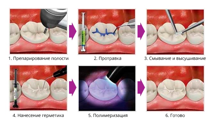 Процедура занимает несколько минут. Стоматолог или гигиенист очищает зуб и готовит состав. Зуб высушивается воздухом. Герметизирующая жидкость наноситься на эмаль и затем закрепляется ультрафиолетовым светом.
