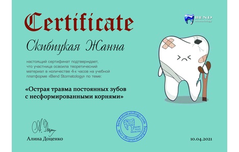 "Острая травма постоянных зубов с несформированными корнями", BEND stomatology, Доценк